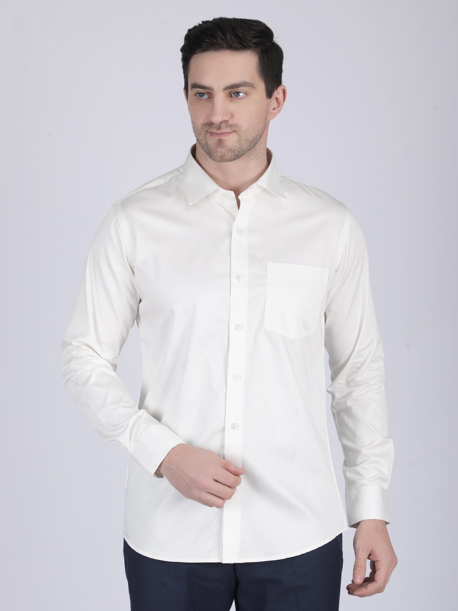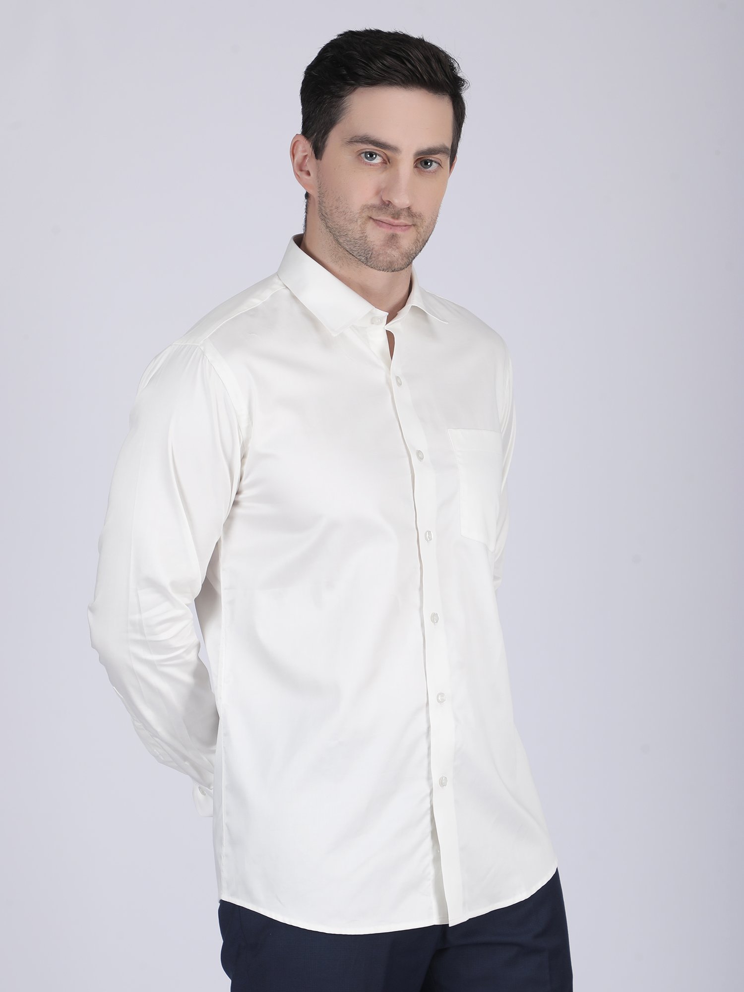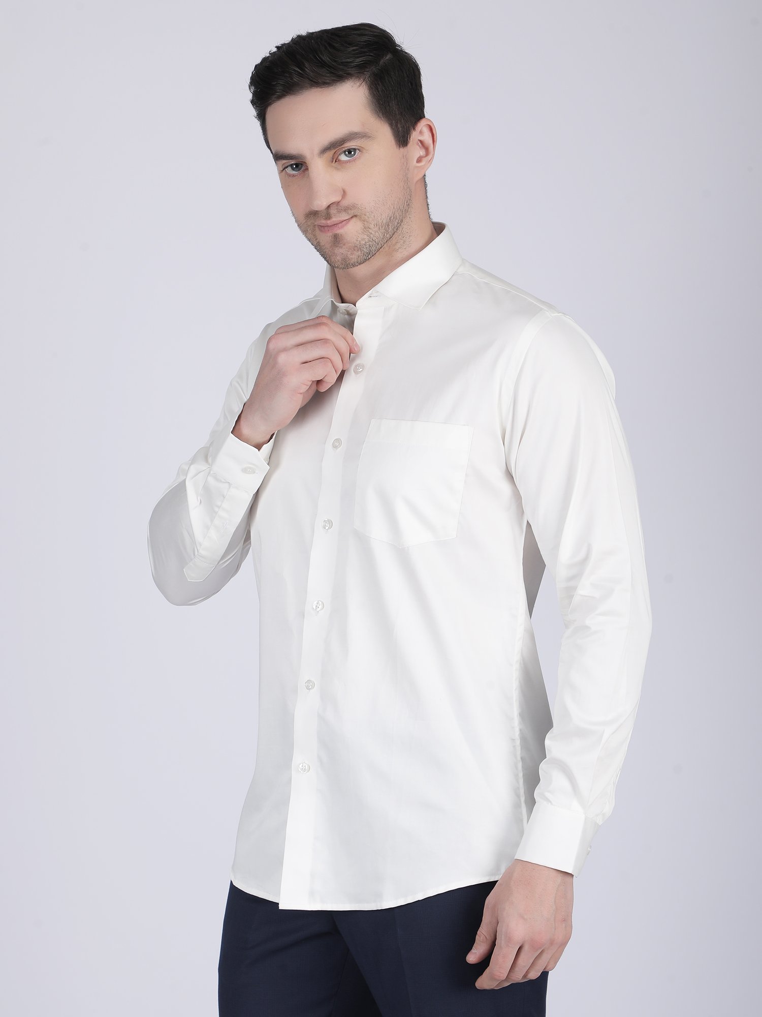 This White Cotton Poplin Formal Shirt with Tailored Fit is designed for reception, office wear, and evening occasions. It brings refined simplicity with a premium feel. The shirt features a clean structured silhouette with a classic spread collar and sharp front placket. It also includes a neatly finished chest pocket, which adds subtle functionality without affecting the minimal design.