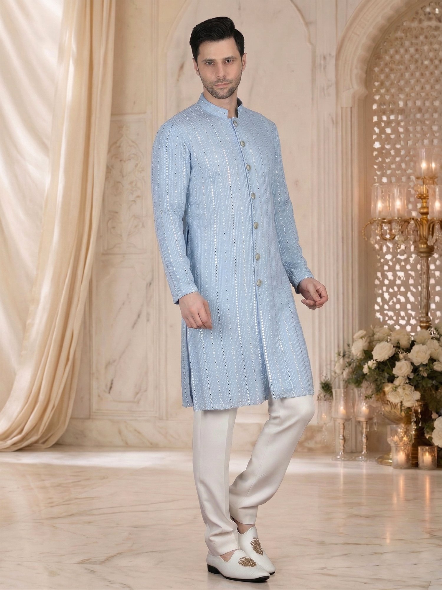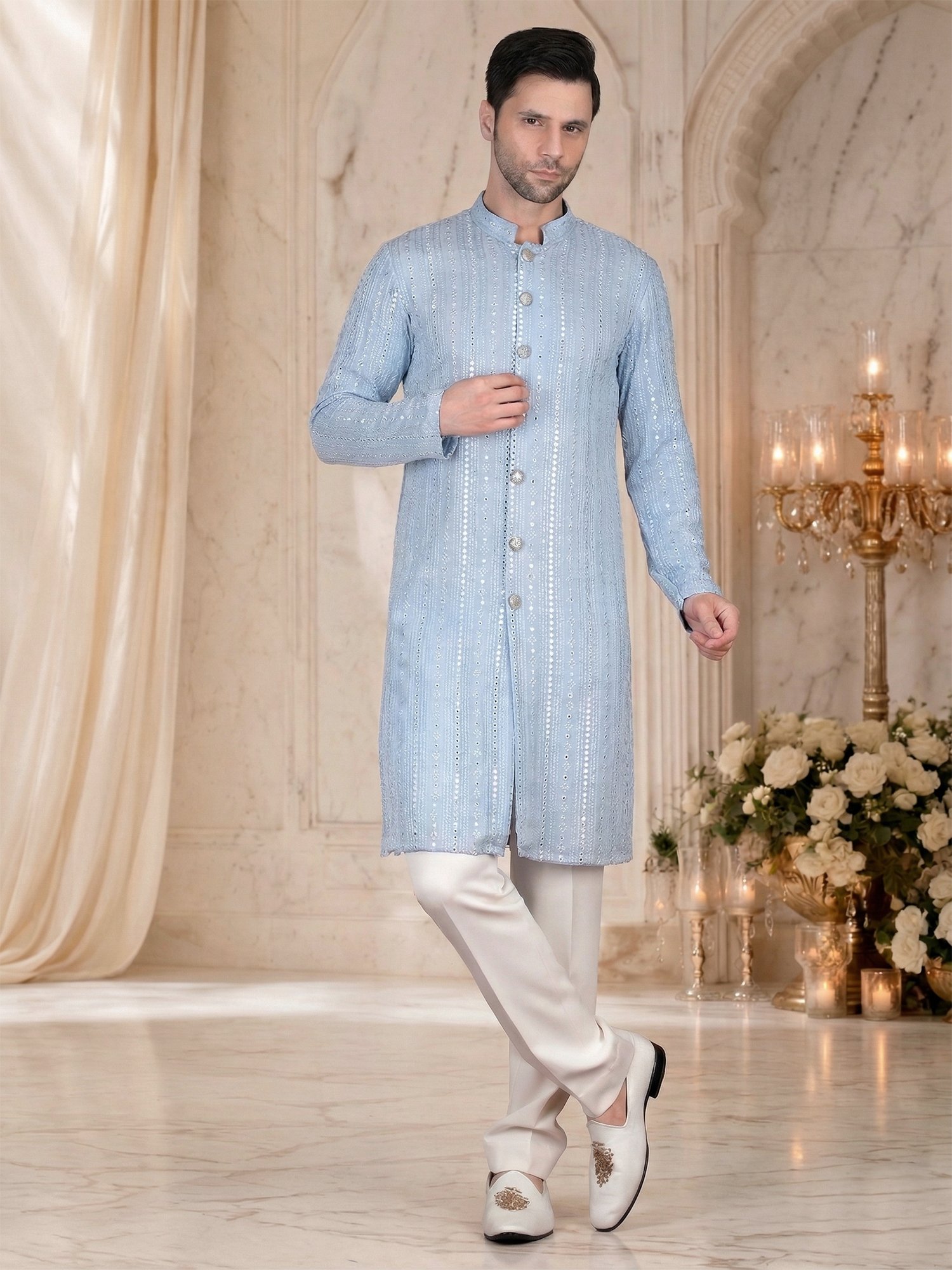 This Sky Blue Thread Embroidery Kurta Set is designed for reception occasions where clean color and detailed craftsmanship create a refined and elegant look. The kurta features a vertical embroidery panel along the front placket, which adds structure and a premium visual line to the outfit. The fine thread work enhances the surface with subtle detailing, so it creates depth without making the design heavy. Therefore, this Sky Blue Thread Embroidery Kurta Set becomes an ideal choice for men who prefer a balanced blend of minimal style and traditional craftsmanship for reception events. Moreover, the sky blue tone brings freshness and sophistication to the overall look.