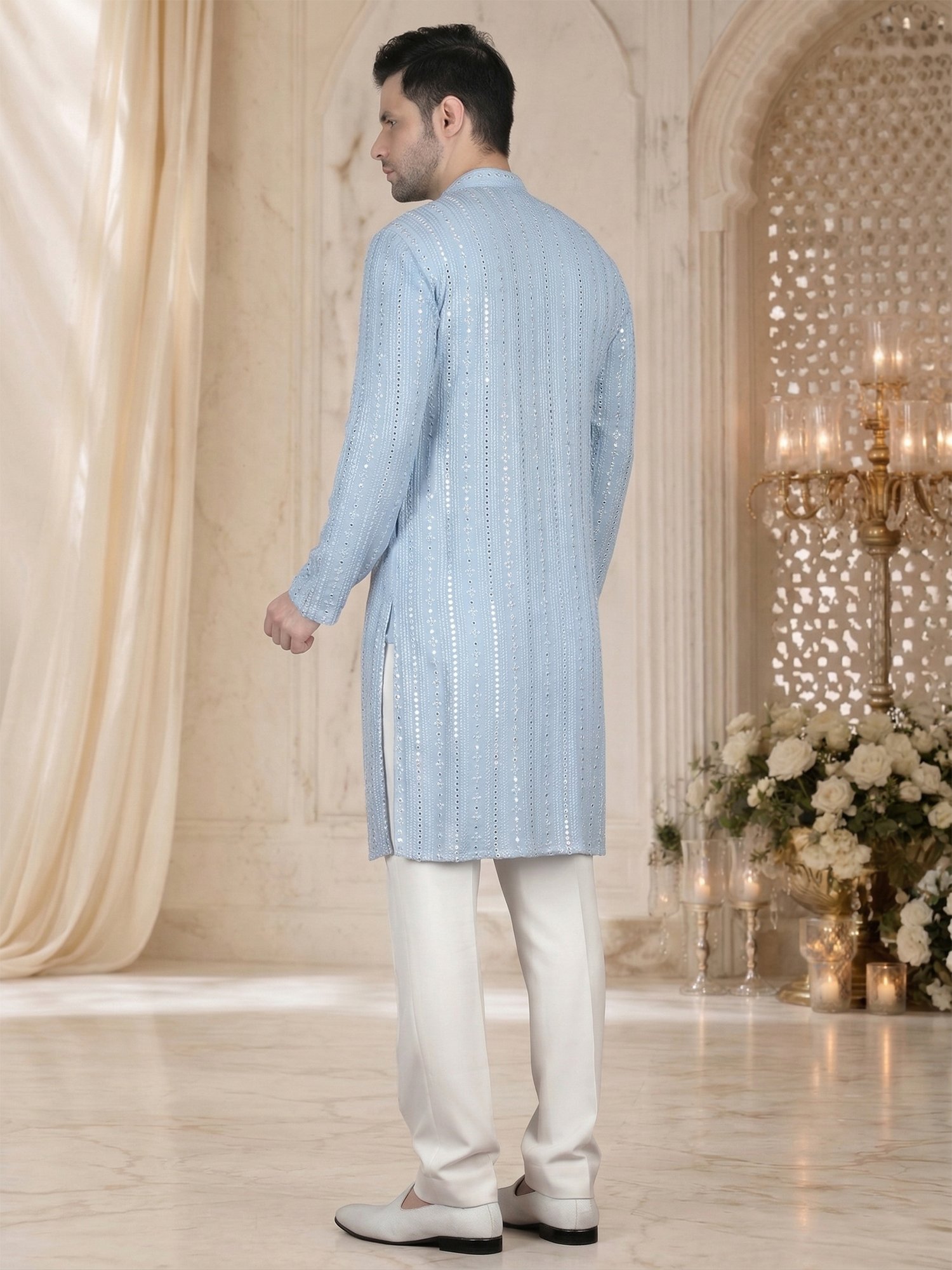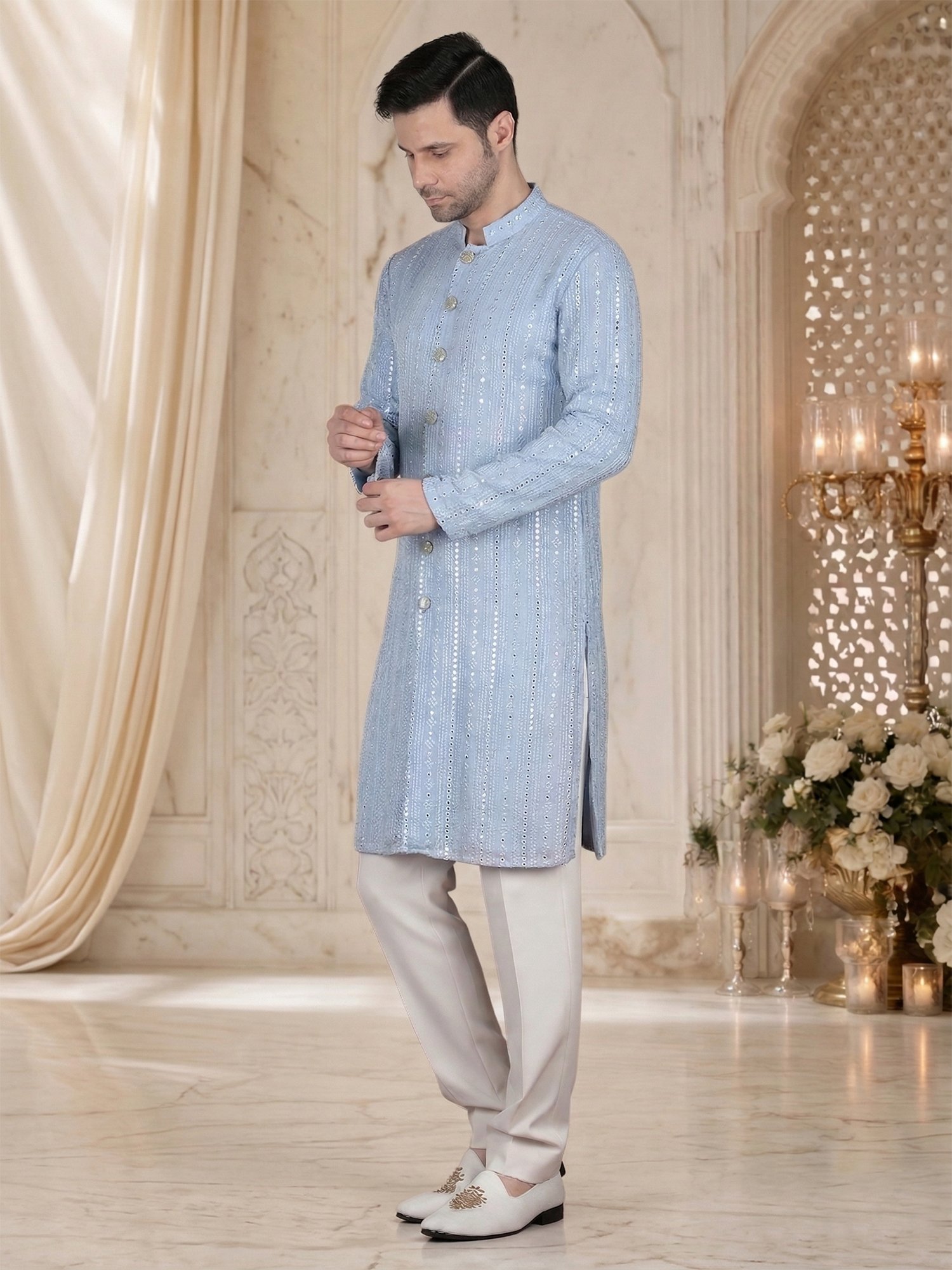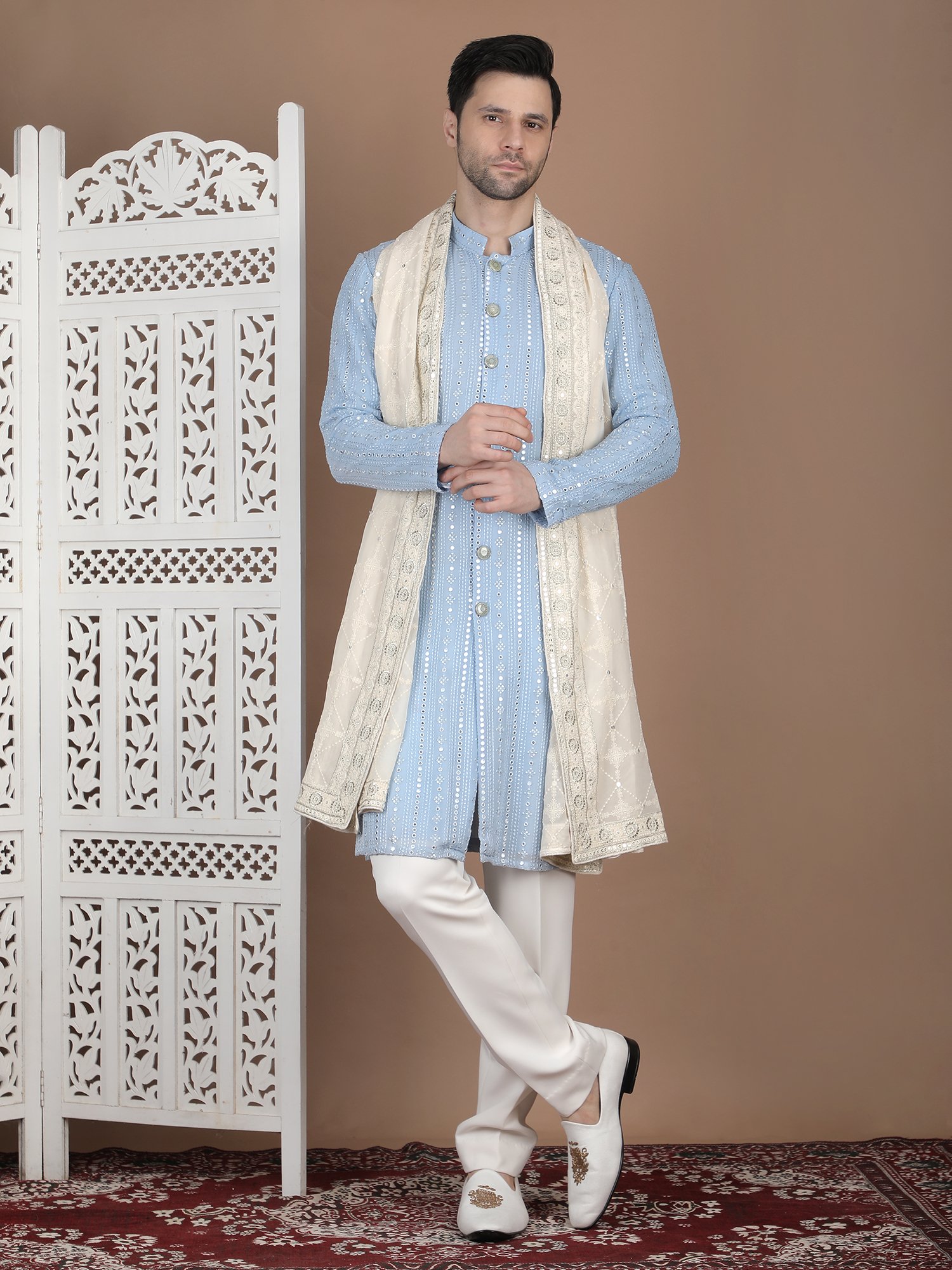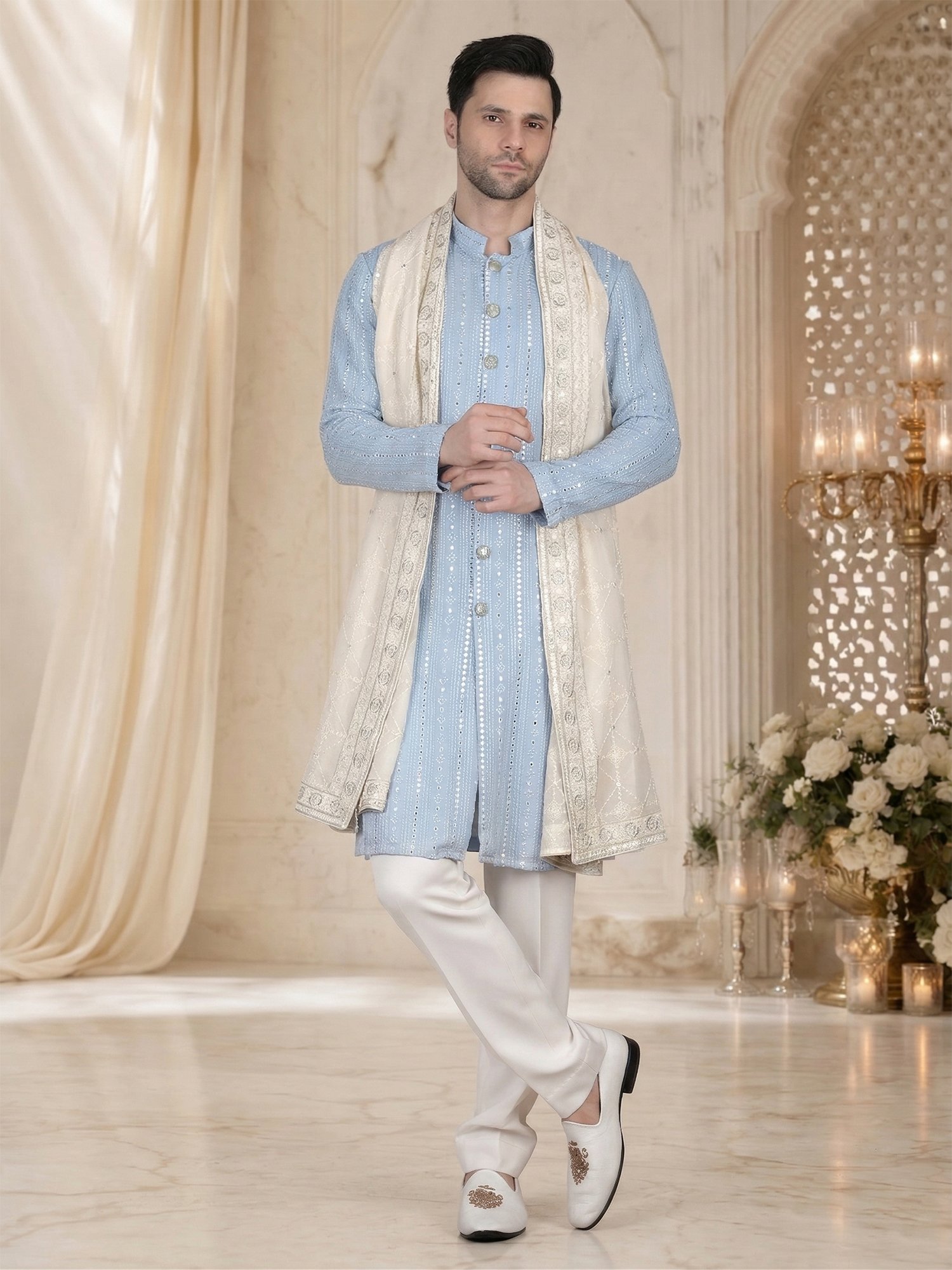 Pair this kurta set with white pajama or trousers for a fresh and balanced look. Keep accessories minimal to highlight the embroidery panel. Complete the outfit with mojris or formal loafers for a refined finish.