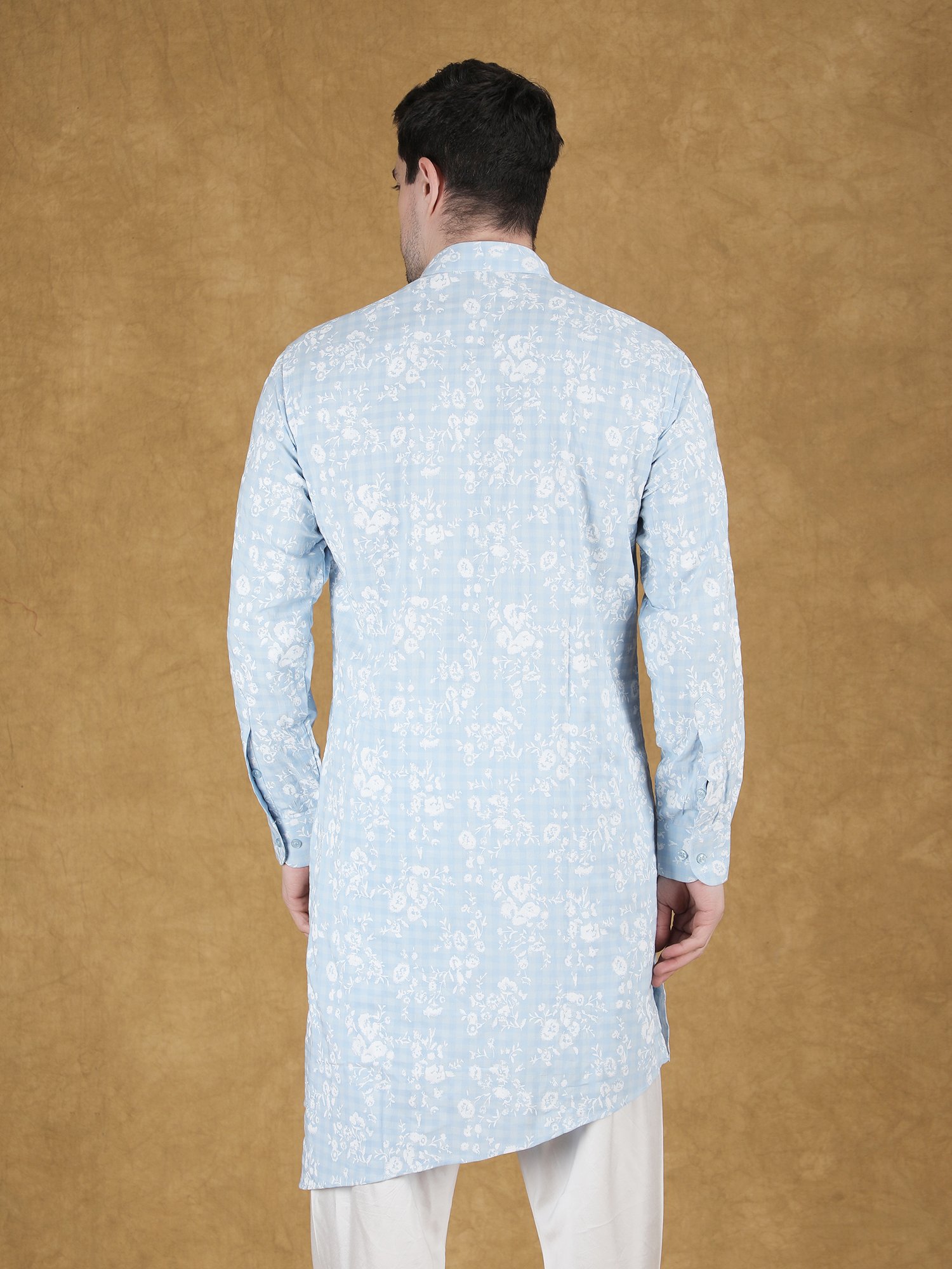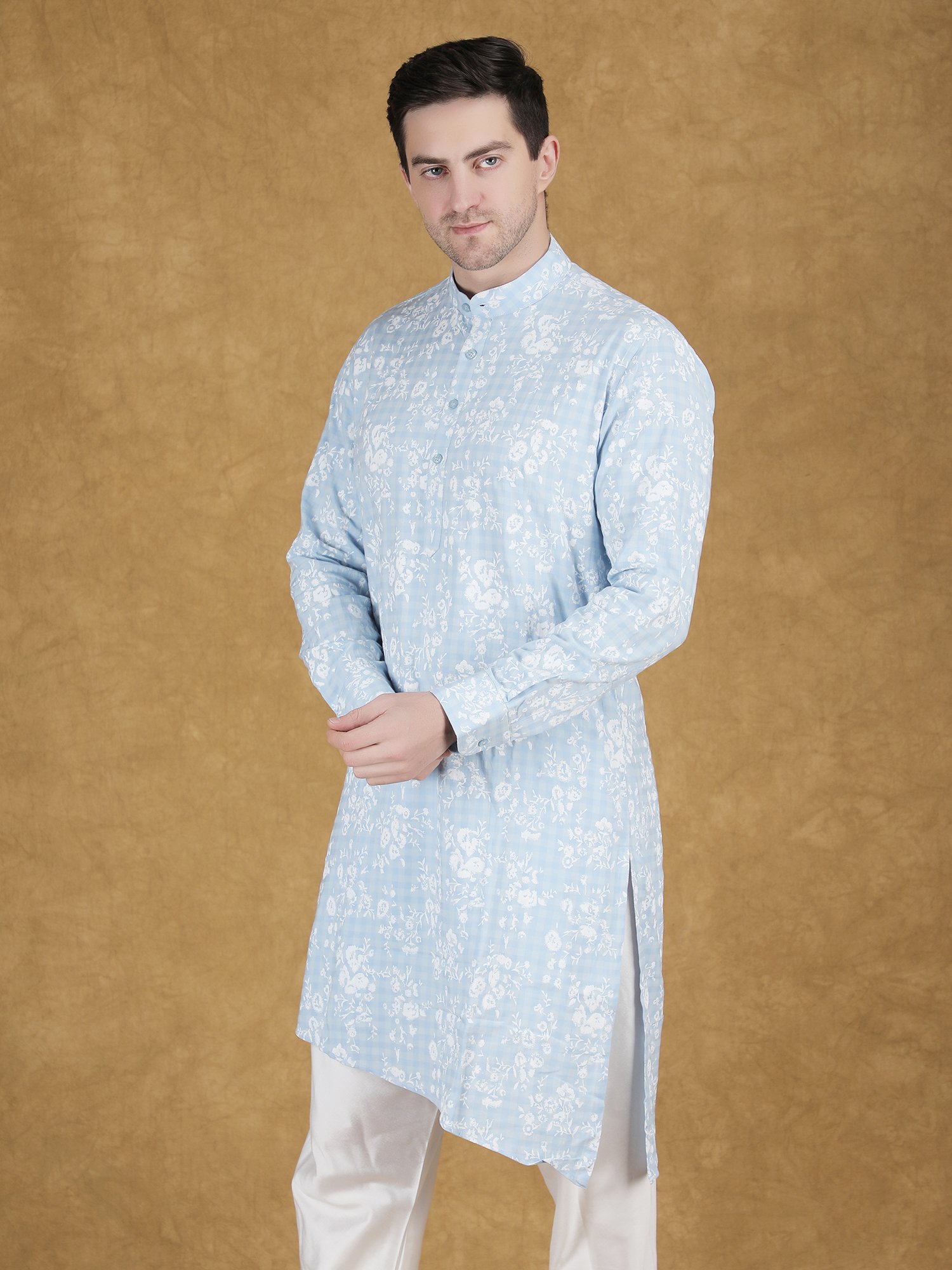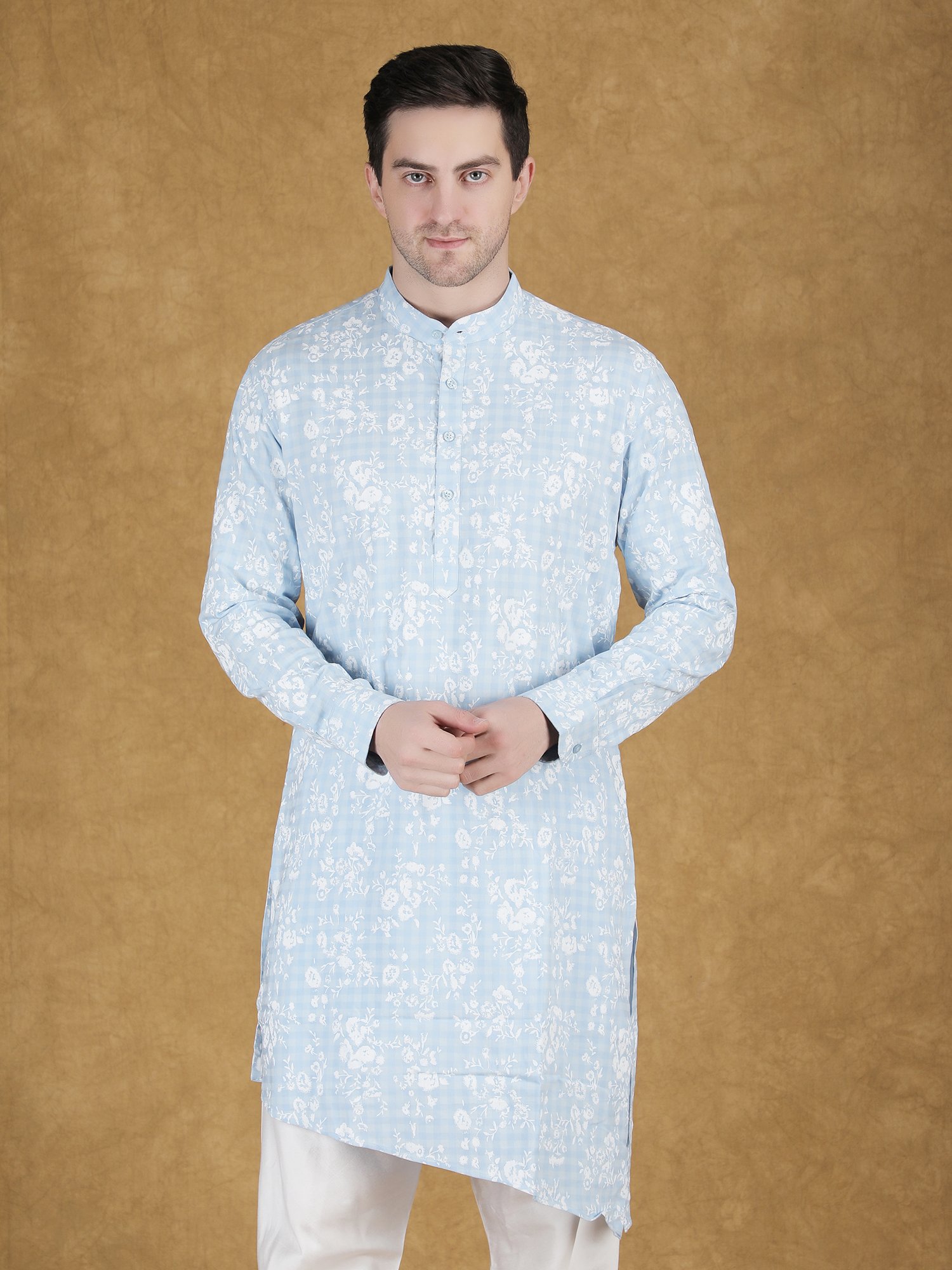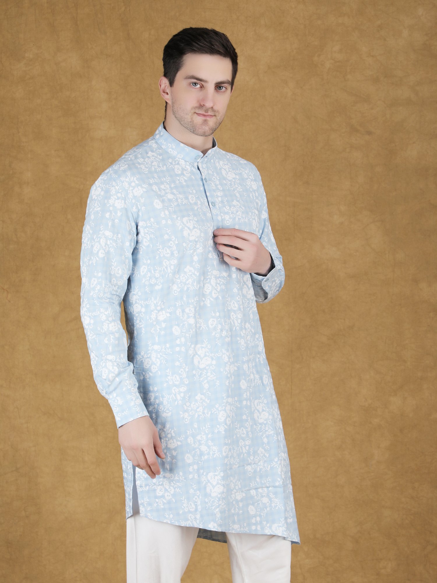 This Sky Blue Floral Check Kurta Set is designed for reception occasions where layered patterns and soft tones create a refined and modern look. The kurta features a unique combination of subtle check texture with an overlay of delicate floral print, which adds depth and dimension to the fabric. The floral elements enhance the surface, while the check base provides structure, so the outfit achieves a balanced and premium appearance. Therefore, this Sky Blue Floral Check Kurta Set becomes an ideal choice for men who want a stylish and contemporary outfit for reception events. Moreover, the soft sky blue tone adds freshness and elegance.