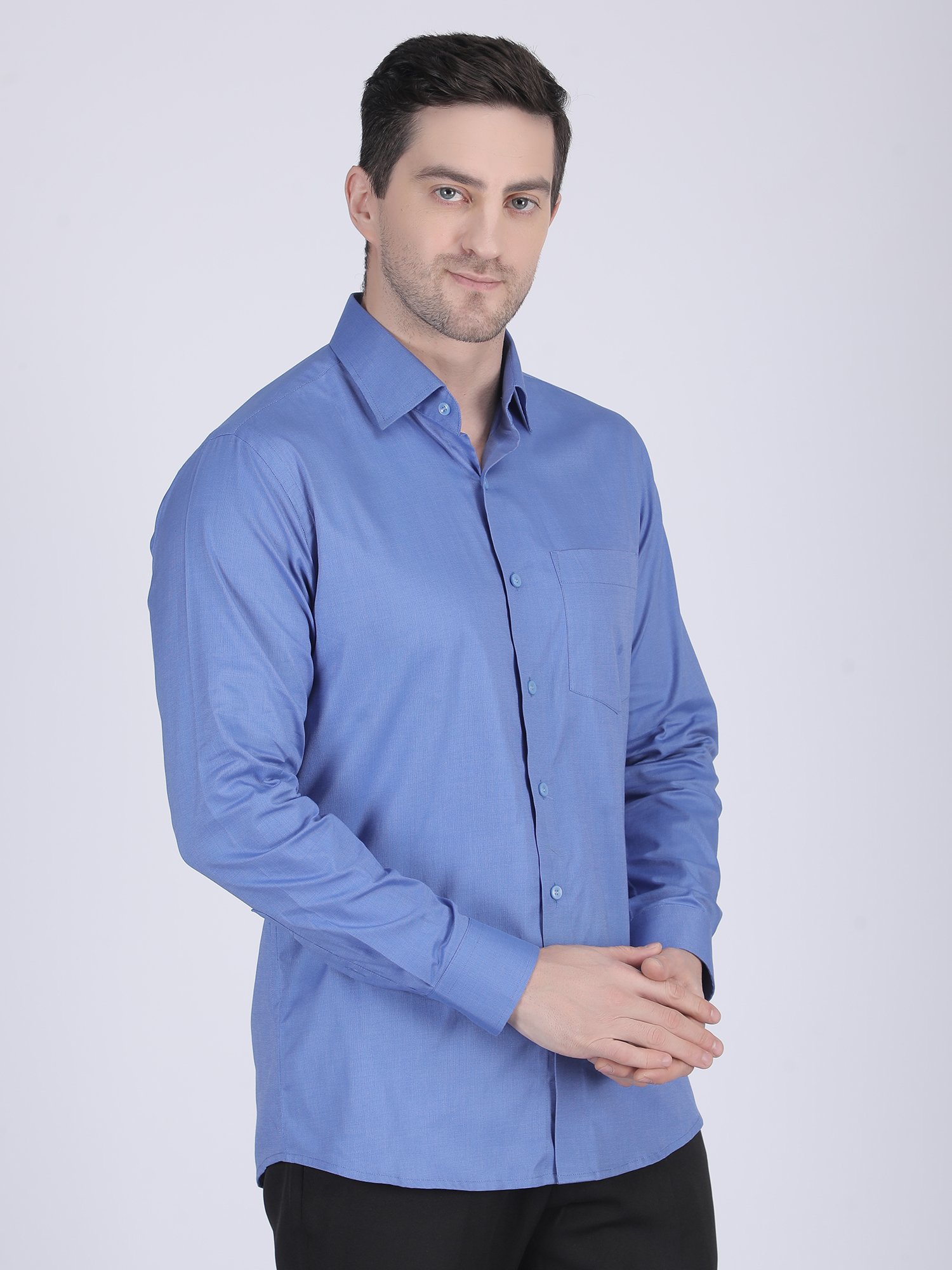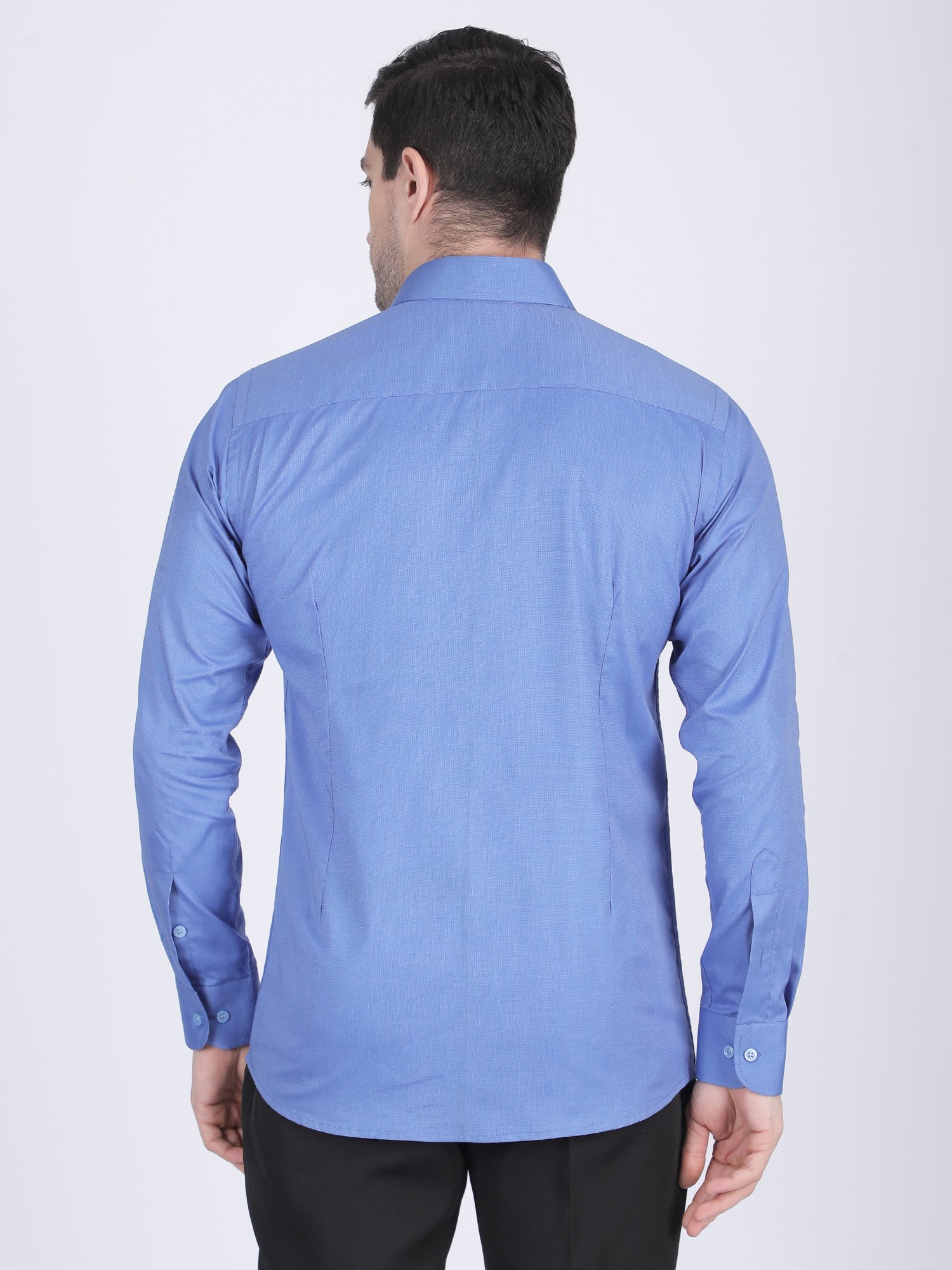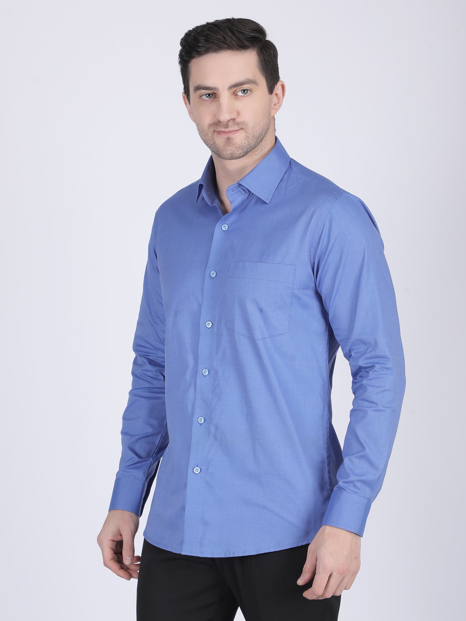The fabric showcases a refined textured weave, which enhances visual richness without overpowering the design. At the same time, it remains breathable and comfortable for long hours. The light blue tone adds freshness and versatility, making it suitable for both formal and semi-formal settings. The tailored fit enhances body structure and maintains a sharp silhouette. Therefore, this Textured Formal Shirt blends simplicity with fabric sophistication, making it an essential premium piece.