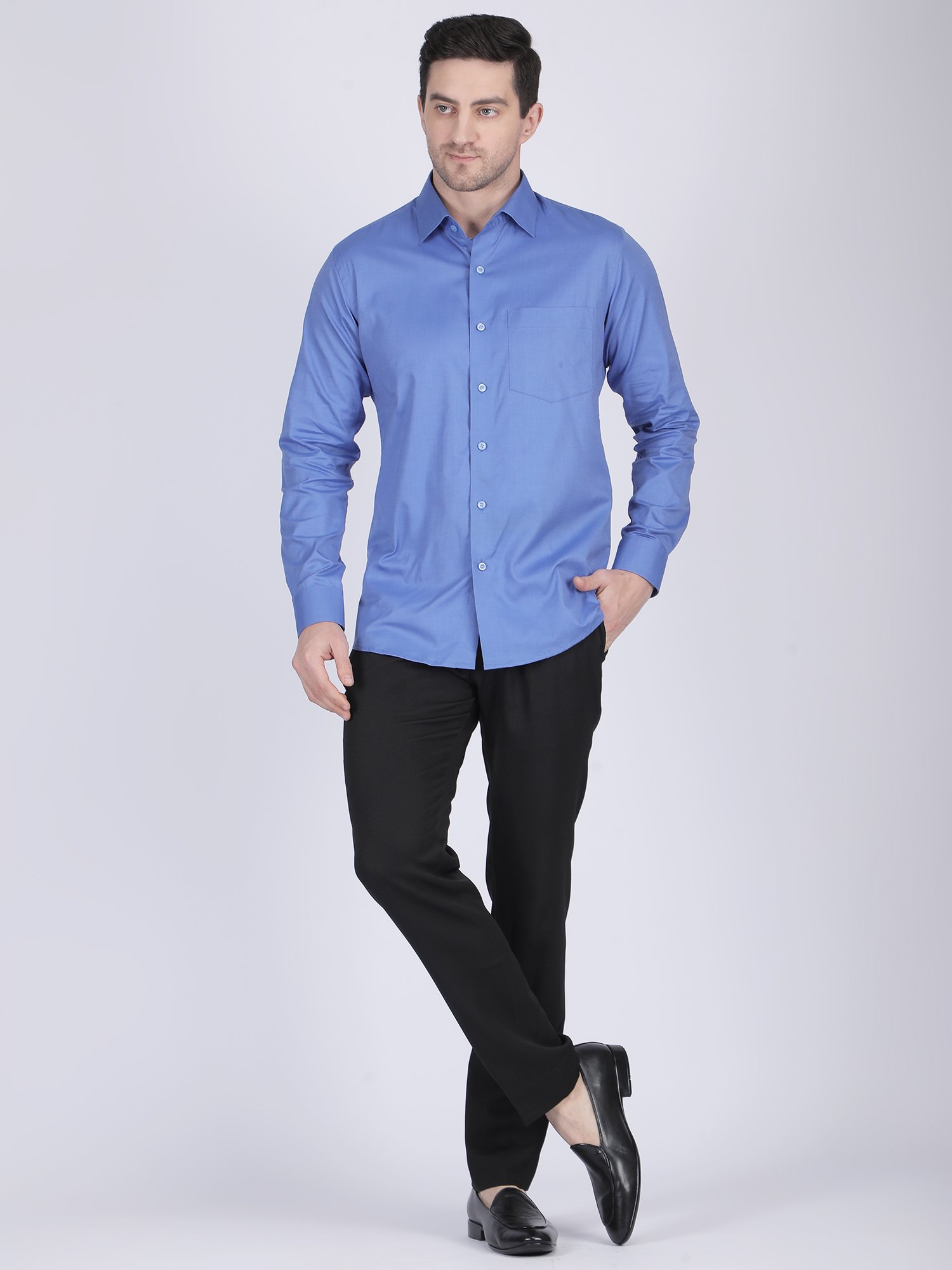 This shirt works perfectly for office wear, formal meetings, and reception occasions. The light blue color creates a fresh and professional look, while the texture enhances the overall richness. As a result, it delivers a confident and versatile appearance.