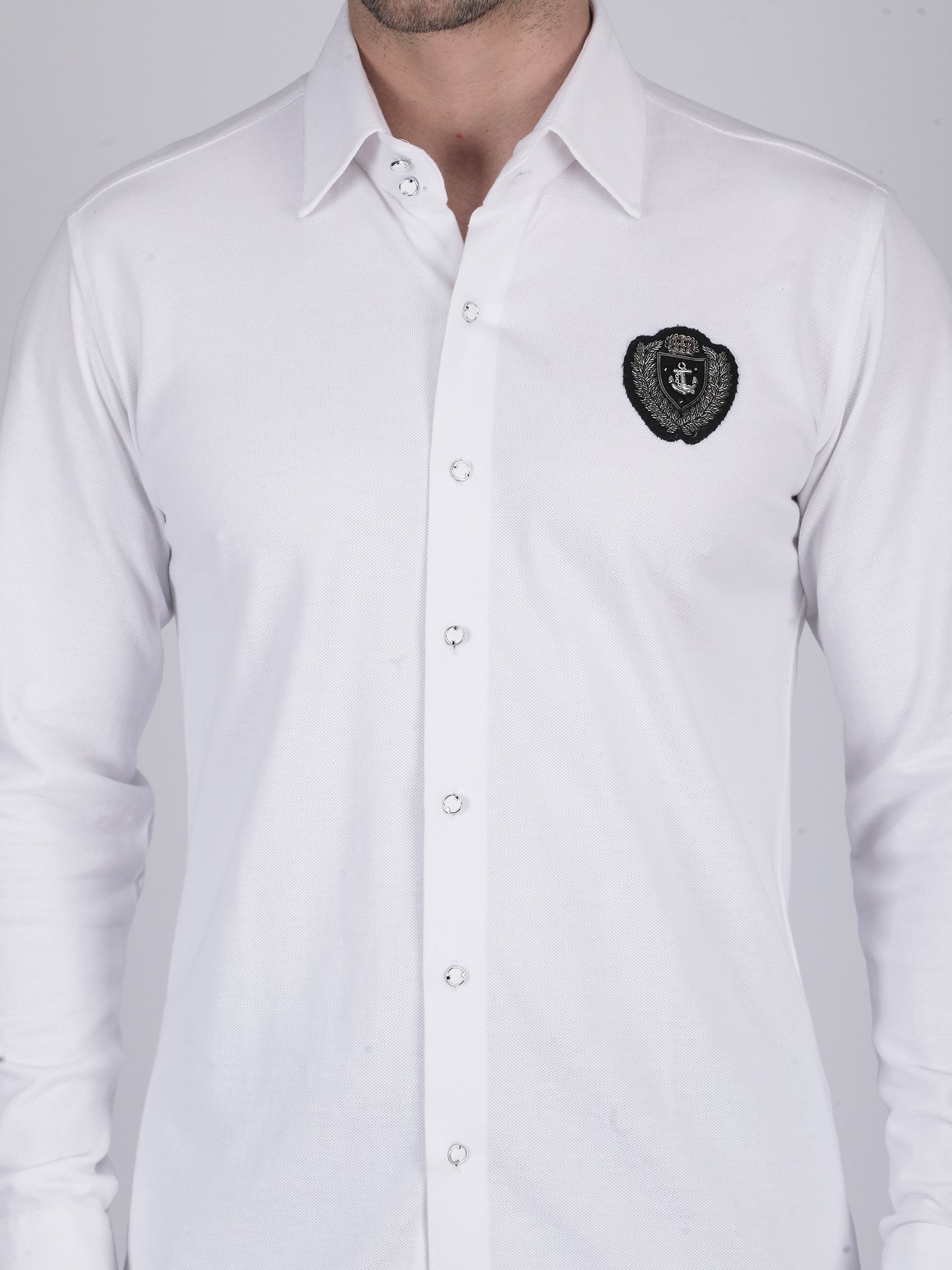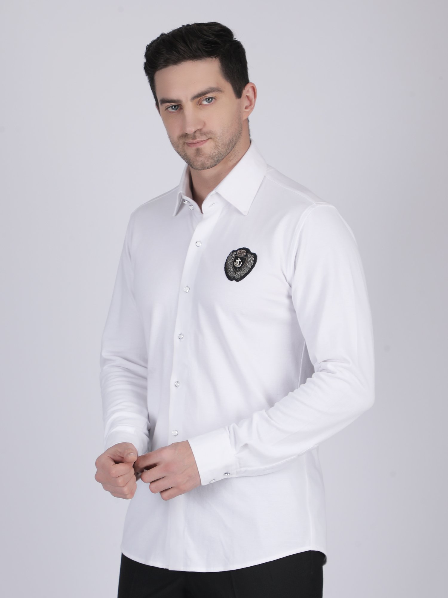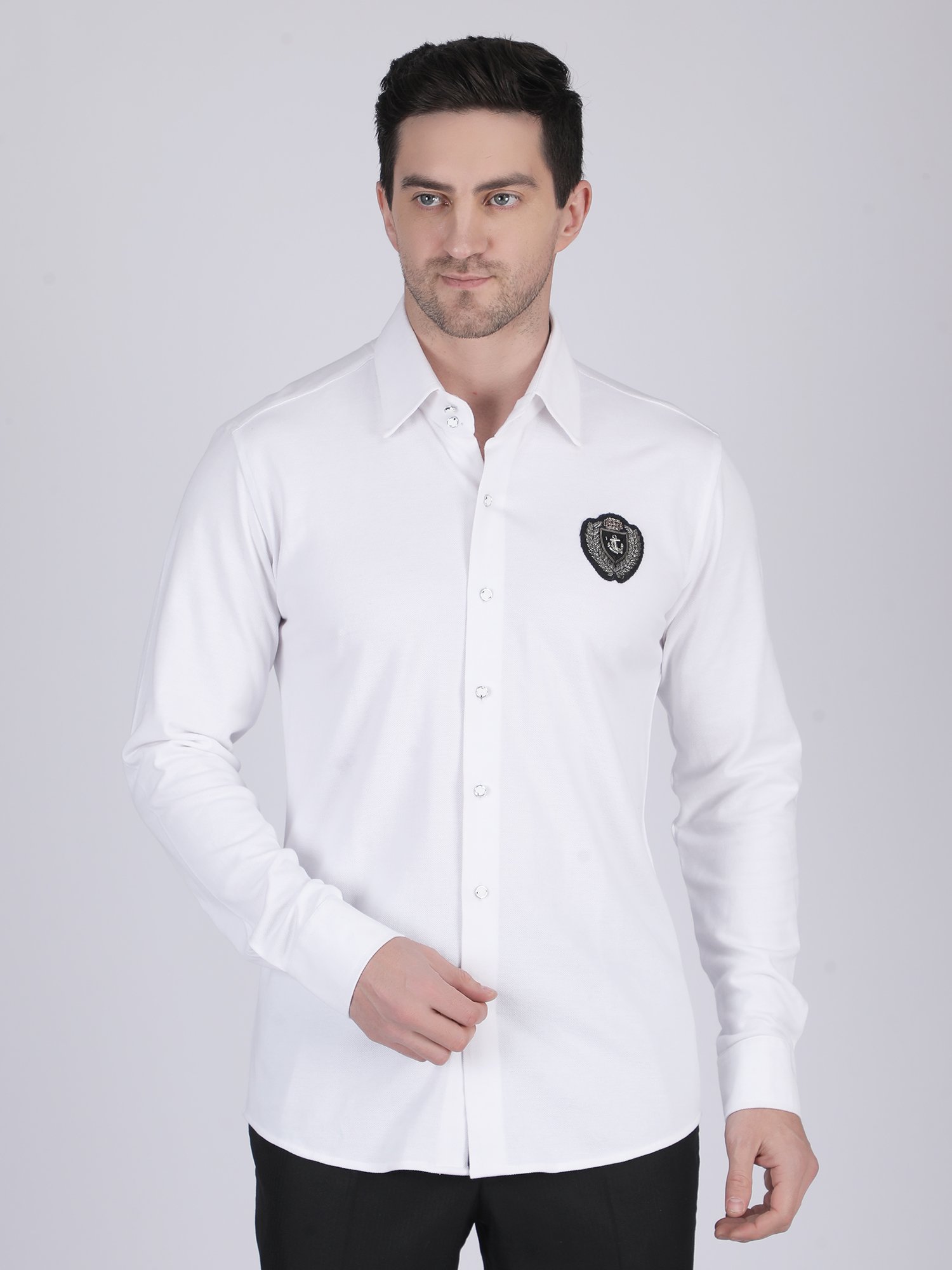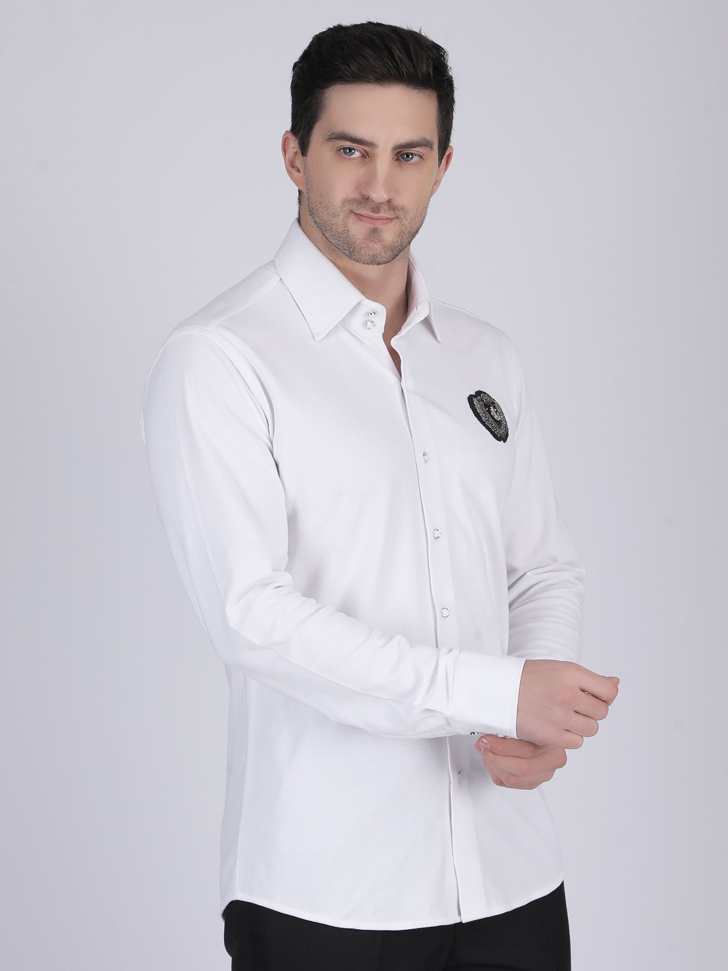 The knitted fabric feels soft, breathable, and comfortable for long wear. At the same time, it maintains a smooth and structured fall that enhances the tailored fit. The hand embroidered chest motif adds texture and a refined design detail, which elevates the overall look. Therefore, this White Knit Shirt blends comfort with craftsmanship, making it ideal for men who prefer minimal yet premium styling.