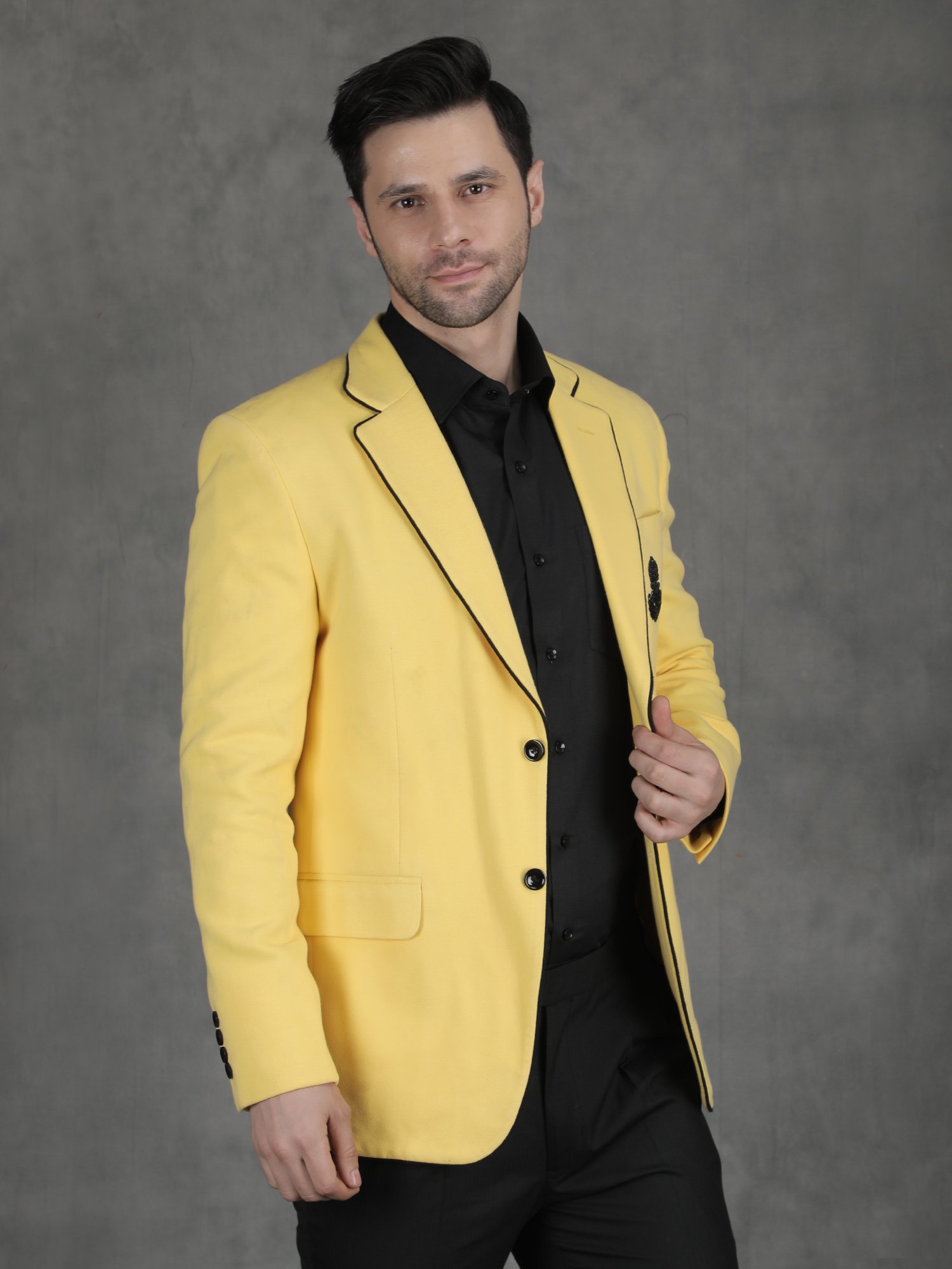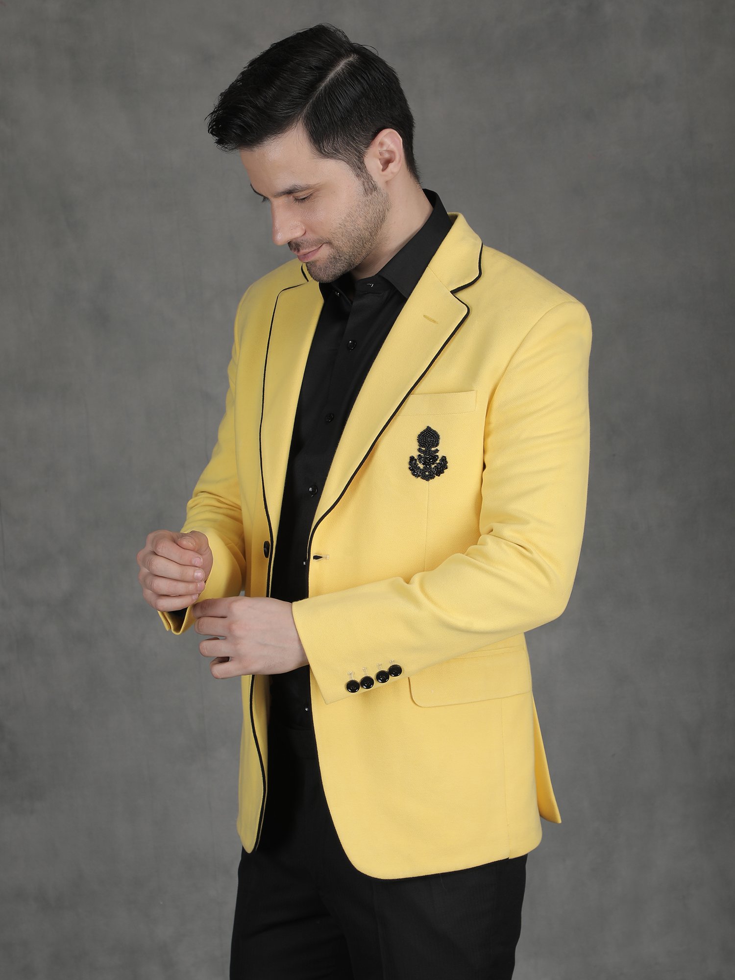 This Yellow Knitted Embroidery Blazer delivers a bold and vibrant look designed for reception and festive evening occasions. The bright yellow tone creates a striking and energetic presence, making it ideal for men who want to stand out with confidence. The chest embroidery adds a refined and premium highlight, giving the outfit a balanced touch of detail. Therefore, this Yellow Knitted Embroidery Blazer becomes an excellent choice for modern celebrations where style and individuality matter. Moreover, the contrast piping enhances the structure, adding a clean and polished finish to the overall design.