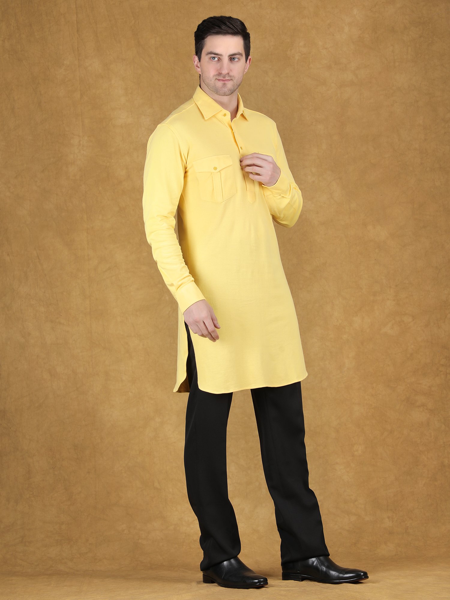 This Yellow Solid Kurta is designed for reception occasions where simplicity and color create a powerful style statement. The kurta features a clean and minimal design with a smooth solid finish, which gives it a sharp and modern appeal. The bright yellow tone brings freshness and vibrancy, so it instantly enhances your presence at any reception event. Therefore, this Yellow Solid Kurta becomes an ideal choice for men who prefer a refined yet eye-catching look without heavy embroidery. Moreover, the simplicity of the design allows versatility in styling for different occasions.